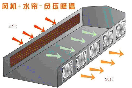 風(fēng)機(jī)水簾負(fù)壓降溫原理: