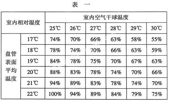 由于風機盤管的除濕能力有限,使得使用水空調的房間空氣相對濕度過高,常常會偏離人的濕度舒適范圍。我國南方由于夏季空氣非常潮濕,使用水空氣造成的室內濕度超標現(xiàn)象更明顯。如果假定盤管的除濕過程很順利,即結露很完全,接觸溫差取3℃?,F(xiàn)查濕空氣焓濕圖并列表分析室內空氣的相對濕度:見表一。