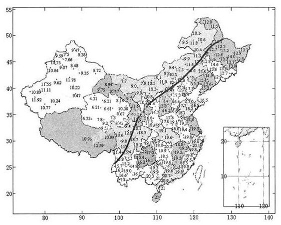 在濕空氣焓濕圖上,25℃的溫度線與60%的相對濕度線相交,交點對應的空氣含濕量為12g/kg(g),可以得出:當空氣的含濕量低于12g/kg(g)時較適宜采用水空調。文獻[3]給出了我國各地最濕月平均空氣含濕量分布圖(如下圖),其中的紅線為含濕量12g/kg(g)的分界線。在線的左側區(qū)域含濕量低于12g/kg(g),較適合用水空調,右側區(qū)域含濕量高于12g/kg(g)不適宜用水空調。