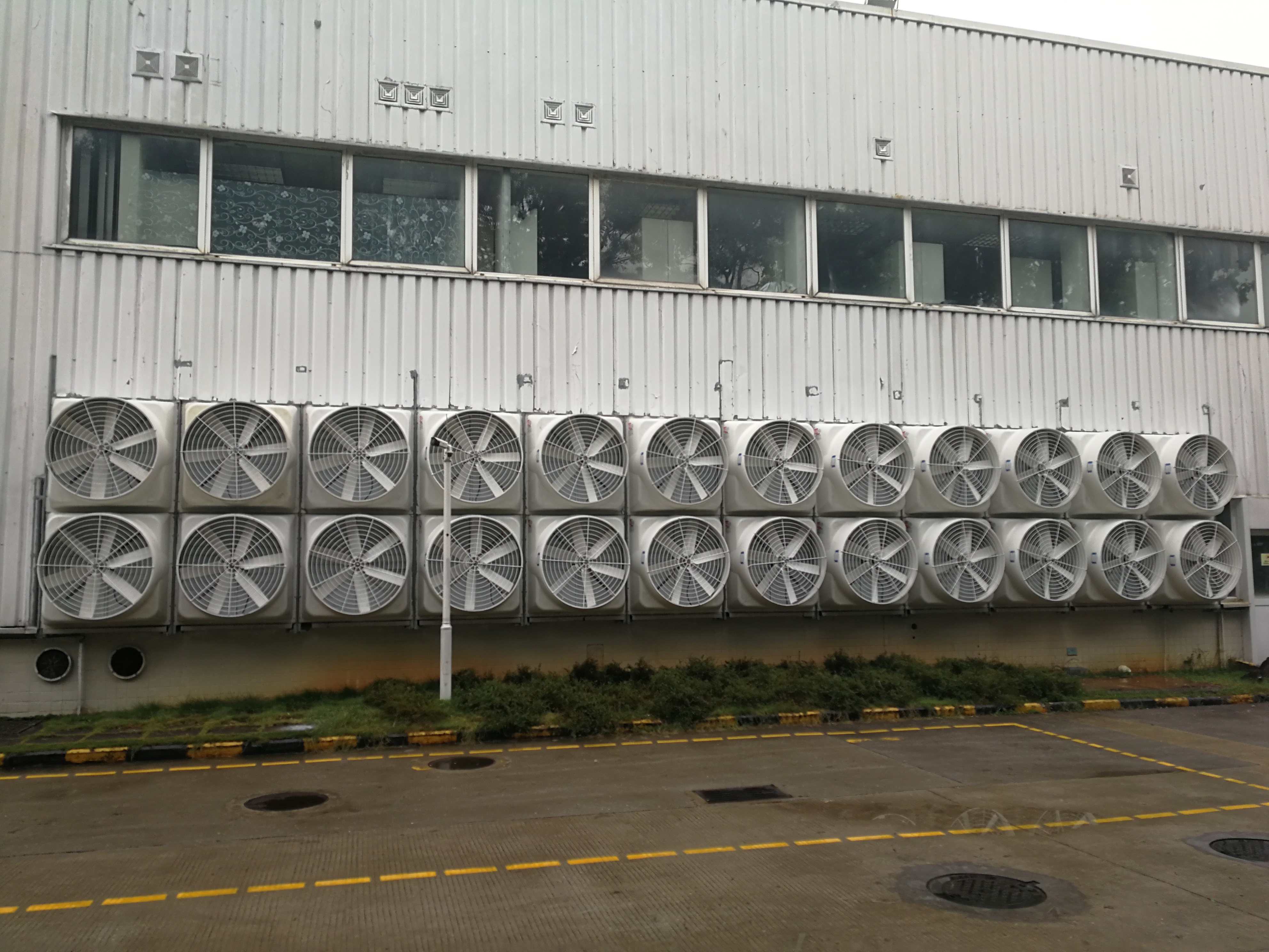 皮具皮革廠車間通風(fēng)散熱系統(tǒng)騰煌工業(yè)風(fēng)扇轉(zhuǎn)動所產(chǎn)生的氣流由上而下形成錐形往地面推動,到地面后沿水平方向流動,遇到側(cè)面阻隔或鄰近風(fēng)扇的水平氣流向上推動到屋面,從而全方位、多角度地強化空氣循環(huán)流通;流動的空氣可以迅速通過門窗與室外新風(fēng)進行交換,減少車間內(nèi)渾濁氣體的滯留,它所持續(xù)的輕柔微風(fēng)能加快人體表面汗液的蒸發(fā)速度從而產(chǎn)生涼爽的降溫效果,很大程度上解決了空調(diào)降溫與高能耗的沖突,在無需安裝空調(diào)系統(tǒng)情況下達到小投資、大回報的效果。廠房車間降溫通風(fēng)之負(fù)壓風(fēng)機,抽排高溫悶熱空氣降溫。